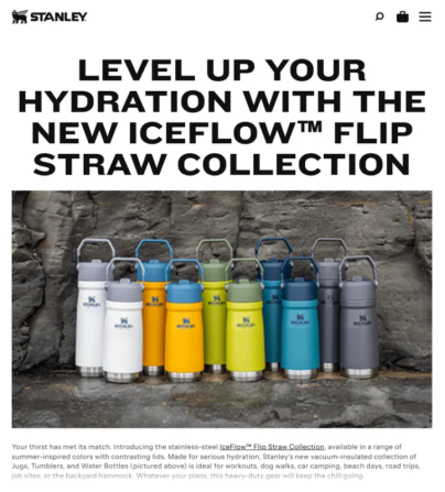 对比之下:Stanley是一家以生产高品质保温杯和水壶闻名的美国品牌,深受户外爱好者和日常用户喜爱。他们用Level Up Your Hydration With The New IceFlow™ Flip Straw Collection(用新款IceFlow™翻盖吸管系列升级你的水杯)吸引了已经了解该品牌的用户。